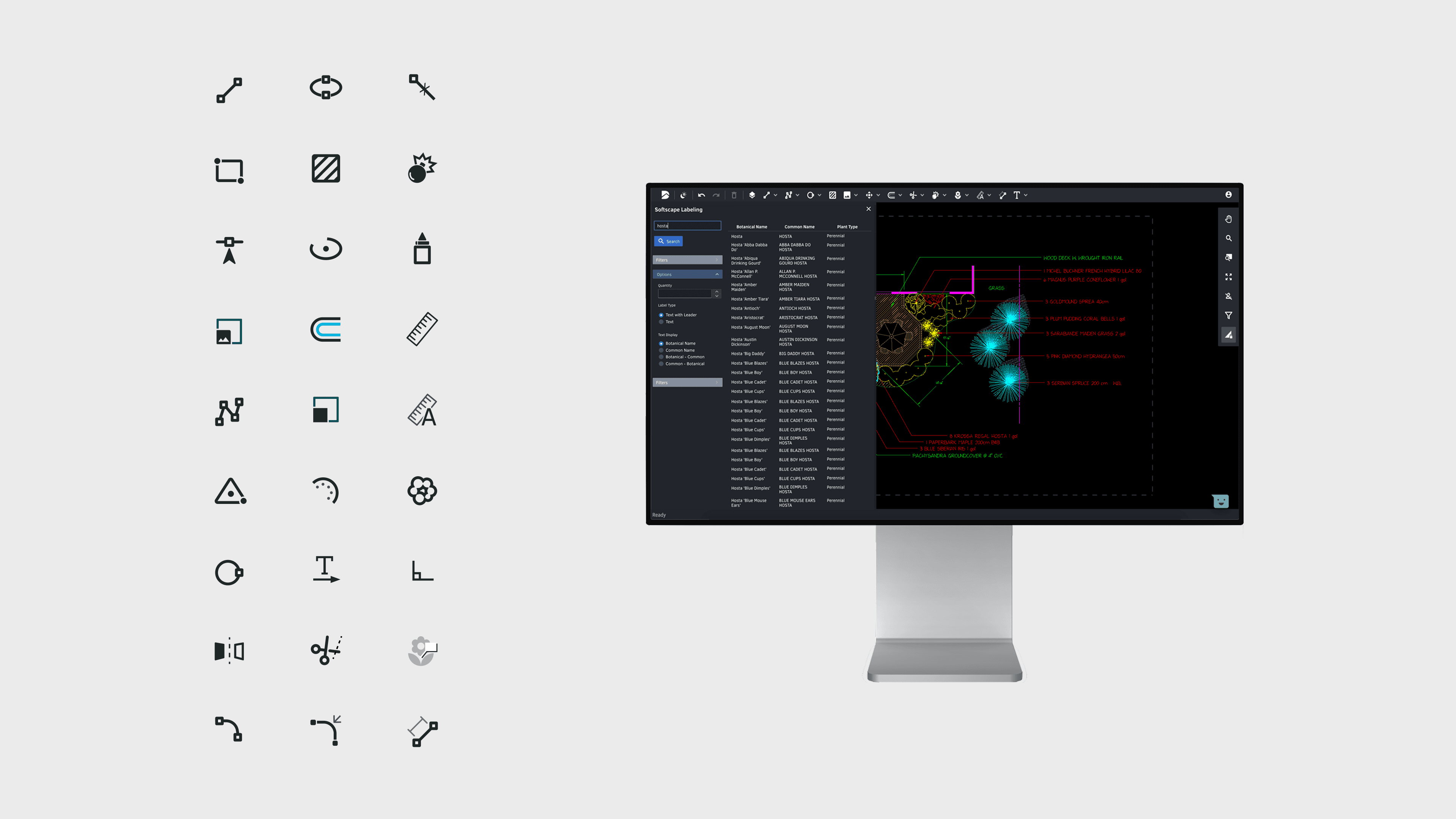 To serve hundreds of landscape designers creating digital drafts, I was responsible for creating a novel, minimal icon set for DynaScape Creator's essential CAD tools and for conducting rigorous usability testing with power users.