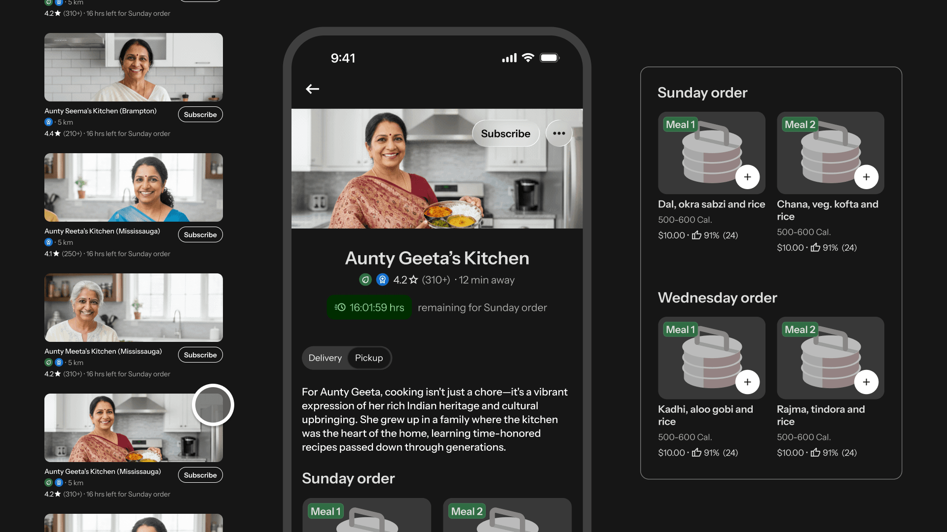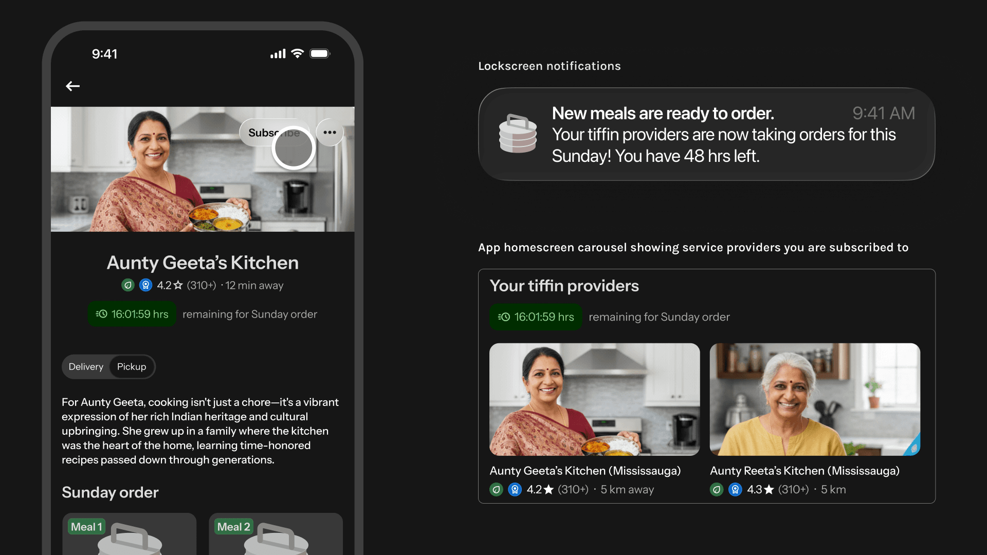 Growing up, lunch was never a question. My mom packed a tiffin every day: dal, sabzi (cooked vegetable), roti, rice. When I started living on my own, that daily ritual quietly disappeared, replaced by whatever I could grab between meetings. I wasn't the only one who noticed the gap. Across the GTA, there's a quiet network of home cooks running tiffin services, selling fresh, home-style meals for working professionals who want something more nourishing than takeout. They manage everything manually: WhatsApp orders, cash payments, coordinated pickups. It works, but it doesn't scale. This project asks what happens when it does.