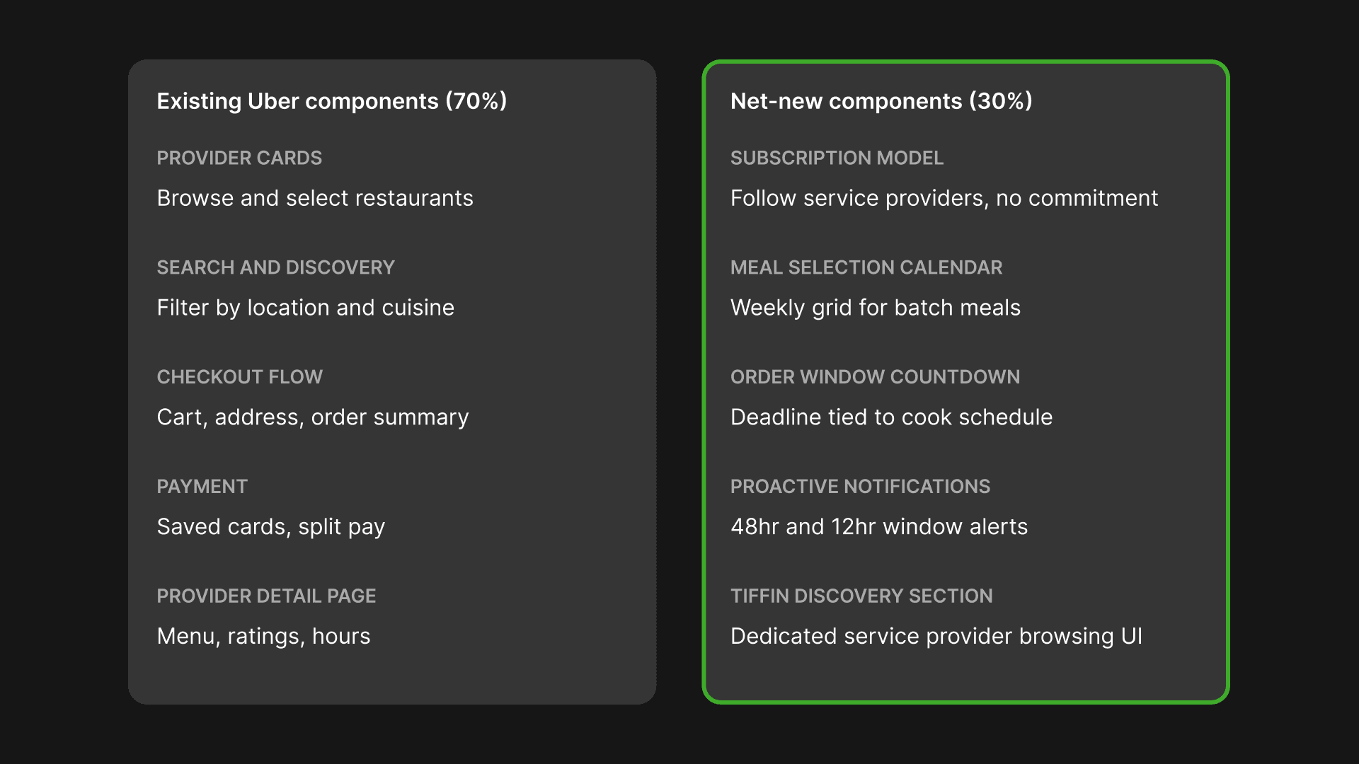 Before designing anything new, I audited Uber's existing component library to find what could be reused. Provider cards, search, checkout, and payment all transferred cleanly. The gaps were specific: subscription management, a meal selection calendar, an order window system, and proactive notifications. Roughly 70% existing, 30% net-new: the design challenge was making the new components feel like they'd always belonged.