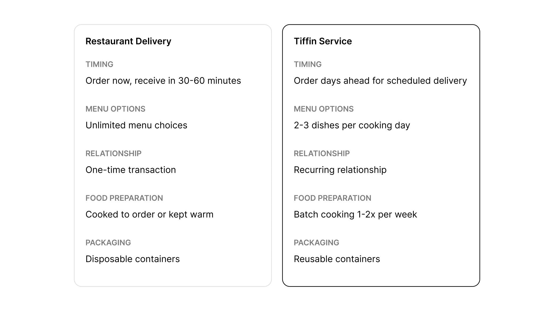 Traditional restaurant delivery and tiffin services have fundamentally different models: