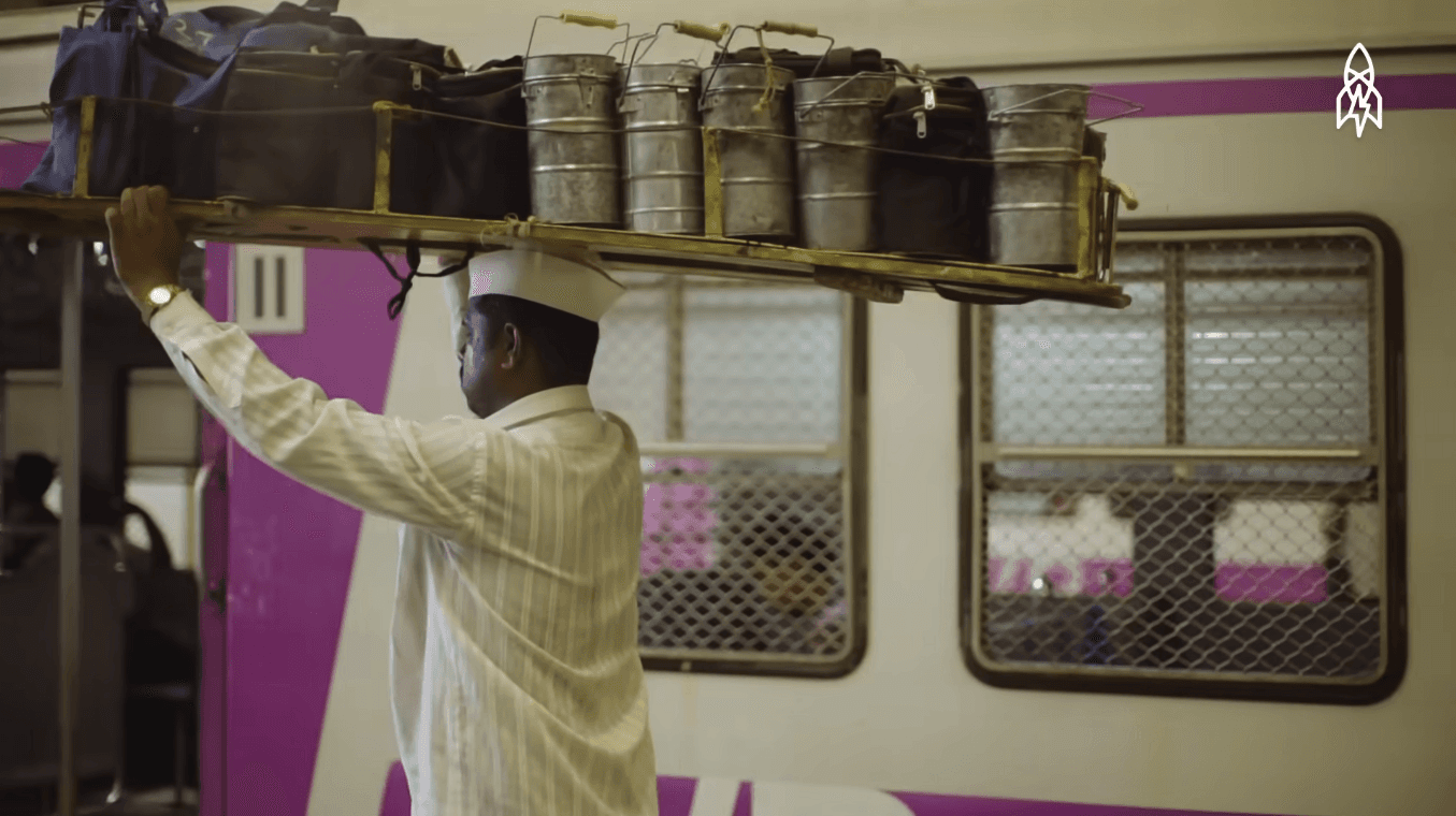A "dabbawala" or delivery person carries numerous working professionals' meals on his head each day in Mumbai, India. Dabbawalas deliver homemade lunches to people across Mumbai—nearly 200,000 of them per day.